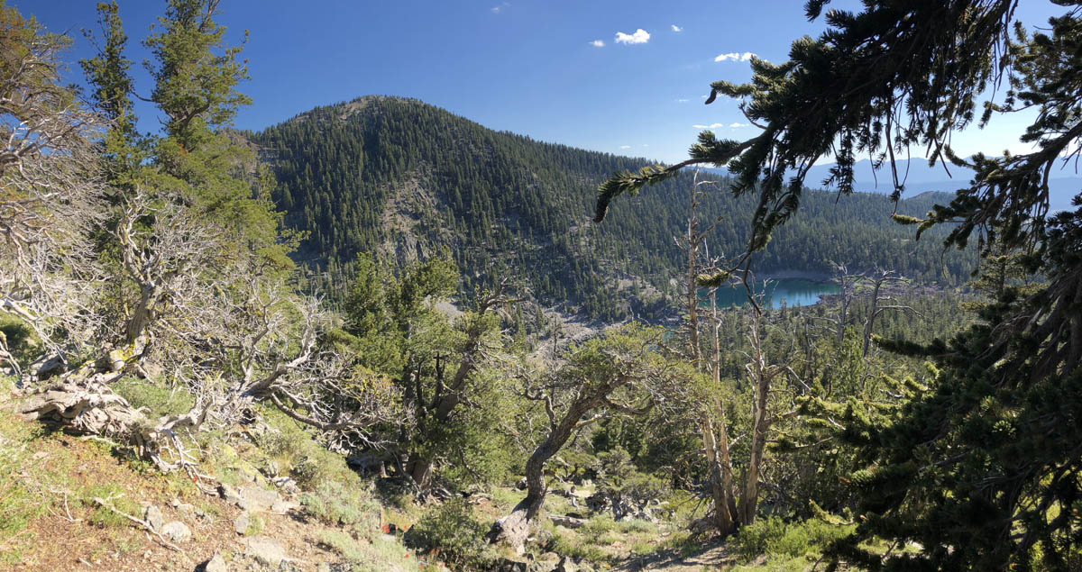 On the hike in, I met a group of travelling artists from Signal Fire and discussed Klamath Forest ecology and diversity.The first stand we visited is along the Pacific Crest Trail above Man Eaten Lake. The ~3 acres of trees have seen >70% mortality in the past few years due to bark beetles and the impacts of a fire that raced up the slope and killed most of these trees.A view of the same stand mentioned above looking north.Impacts from the high intensity fire in Wooley Creek (left drainage) is evident from above the Pacific Crest Trail.The second stand we visited is just above Gem and Jewel lakes and approximately 2 acres in size. This stand has seen significant mortality (50%) in the past 10 years due to bark beetles. You can see the gap in the trees in the center right of the picture where many more whitebark pine once were.A scraggly, old whitebark pine above Shackleford Creek in the Marble Mountain Wilderness.
