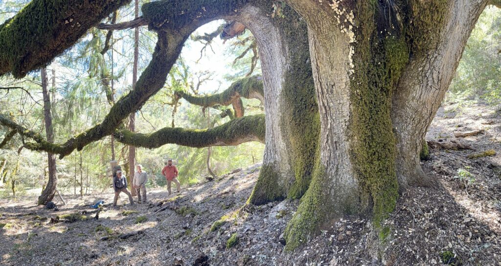 I recently visited this tree because I care deeply about old ones. While there, I mapped it using the Polycam app on my iPhone, capturing LiDAR data that begins to tell its story in another way. By measure alone, it commands attention: 34’8″ in circumference, 57 feet tall, with an 80-foot crown spread—totaling 493 American Forests points. One of the largest known canyon live oaks (Quercus chrysolepis), its massive limbs carry centuries of growth, disturbance, and survival. But like many of our largest trees, it is beginning to decline.